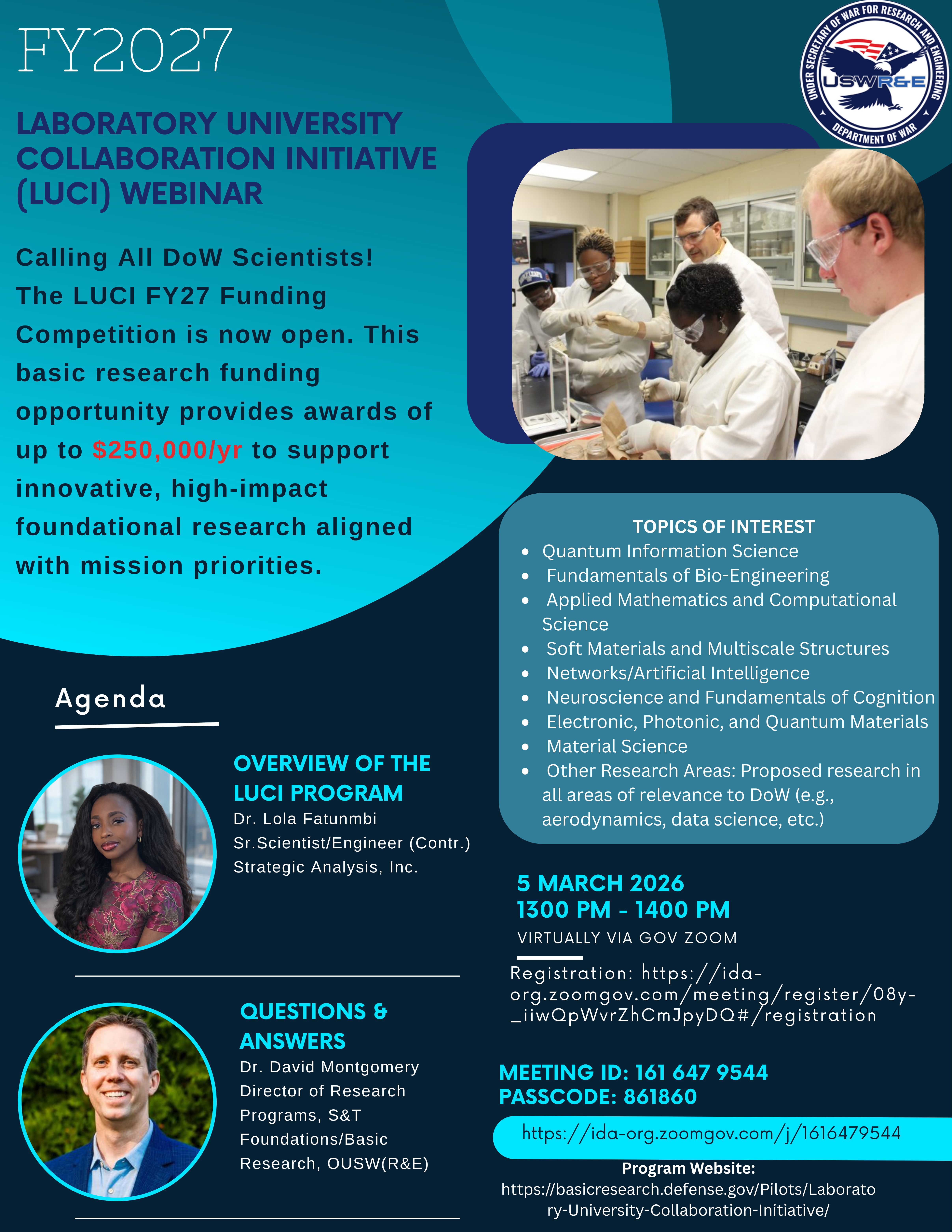 The FY2027 Laboratory University Collaboration Initiative (LUCI) Competition is now open and virtual webinar will take place on Thursday March 5th. Link to register: https://ida-org.zoomgov.com/meeting/register/08y-_iiwQpWvrZhCmJpyDQ#/registration